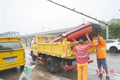 市政人员在易形成积水的人民路怡光路店后立交桥下安放冲锋舟。