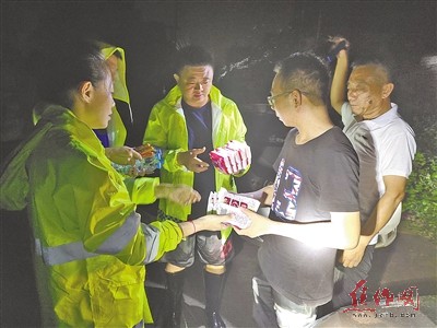 李封街道领导班子夜查风险隐患,并为在岗防汛人员准备了充足的食物、水和防雨物资。