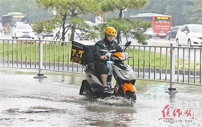 7月20日15时,在市政二街红绿灯处,一名全副武装的外卖骑手,利用等红绿灯的空隙,赶紧翻看着手机上的单子,记者问这名外卖骑手下雨天能送多少单子。“二三十个单子吧。”听声音,记者才发现她是一名女外卖骑手。信号灯一变绿,她第一个飞驰而去,娇弱的身子消失在风雨中,她放在后座上饭箱上写着一句话格外明亮——“刚出锅的味道,想让你知道”,还画有一个萌萌哒的外卖骑手漫画,在风雨中看到这一幕,让人泪目。