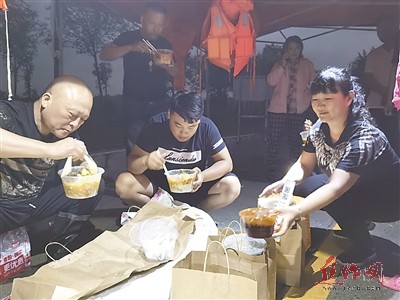 20时许,赵红霞一行人终于赶到了目的地,将还热乎的羊肉泡馍递到了防汛一线人员的手中,并向他们表达了感谢之情。