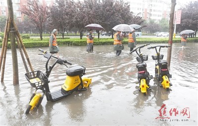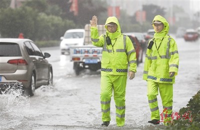 县公安局交警大队民警在城区积水路段指挥车辆有序通行。