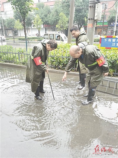 7月19日,温县防汛抗旱指挥部办公室组织抢险组在城区道路清理雨水收集口异物。