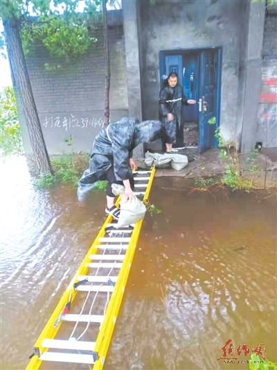 焦作移动抢险突击队员架云梯运沙袋保基站。苏利明 摄