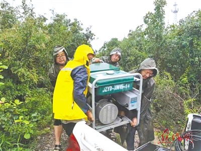焦作移动抢险突击队员在暴雨中抬发电机上山发电。 武 晓 摄