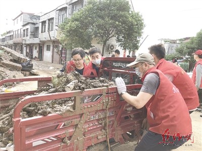 在完成本校清淤消杀任务外,焦作一中还派出党员志愿者奔赴受灾较重的光亚新村开展清淤清扫工作,帮助居民重建家园。光亚新村正好位于瓮涧河泄洪口,居民房屋多处进水,街道上到处都是污泥、垃圾、树枝和建筑残骸,居民出行困难。该校党员志愿者赶到后,发扬不怕苦、不怕累的精神,站在污泥中把散发臭味的垃圾装车运走,他们不顾泥点飞溅、不顾汗流浃背,一心只想让居民的生活环境更健康。经过近4个小时的努力,光亚新村街道上的垃圾、淤泥和积水基本清理干净。