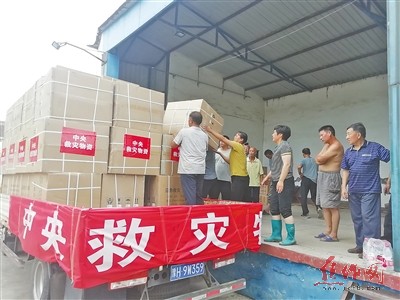 中央救灾物资运抵示范区文昌街道孙村后,村民们在忙着卸车。