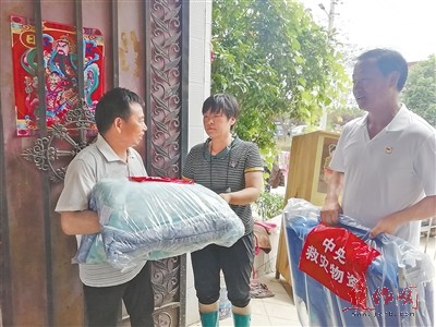 在该村村民崔和平家,记者看到墙壁上仍有被水淹过的痕迹,在水中泡过的家具有的已经发霉,院内外晾晒的衣物随处可见。看着村干部送来的折叠床、毛毯等救灾物资,腿脚不便的崔和平不禁红了眼眶,激动地说:“之前政府安排我们撤离到安置点,现在中央又发放救灾物资,真的太感谢了。”