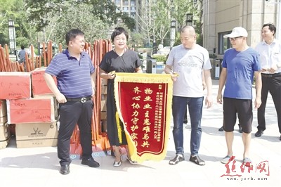 刘淑华(左二)收到业主们代表送来的锦旗。