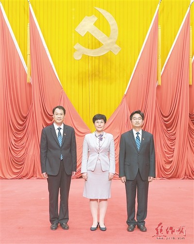 新当选的中国共产党焦作市第十二届委员会书记葛巧红(中),副书记李亦博(右)、李民生(左)。