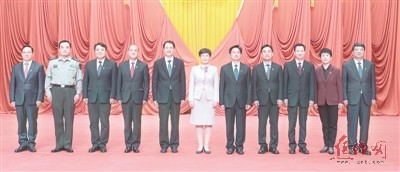 新当选的中国共产党焦作市第十二届委员会常务委员葛巧红(中)、李亦博(右五)、李民生(左五)、郭鹏(右四)、宫松奇(左四)、牛书军(右三)、路红卫(左三)、闫小杏(右二)、刘同兴(左二)、董炳麓(右一)、王朝杰(左一)。