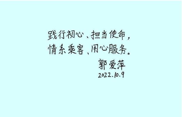 行万里路,载千万客。郭爱萍用她的一言一行,让乘客获得快乐,用她的一举一动,让线路成为风景。她以朴实无华的行动在平凡的岗位上诠释着人生的真谛,用一颗真诚的心感染着身边的人。我们每一个人都应该致敬楷模、学习楷模,在平凡的岗位取得不平凡的成绩。