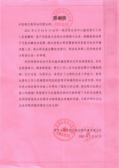 “电信诈骗的犯罪嫌疑人大多异地作案,很难侦破并抓获,你们不仅有效识别,还协助我们抓获犯罪嫌疑人......”3月初,焦作市公安局山阳分局刑事侦查大队X警官来到中信银行焦作分行营业部表示感谢,并送来感谢信。