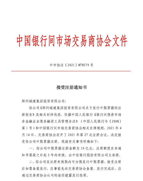2021年4月21日,郑州城建集团投资有限公司2021年度第一期中期票据在中国银行间市场交易商协会完成注册,注册金额10亿元,由中信银行担任主承销商。