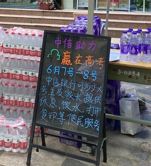 中信银行郑州分行为广大考生及家长提供力所能及的便民服务。为考生提供考试用品,鼓励考生放松心态,积极应考,并为家长、交警、特警等服务人员准备了清凉的矿泉水及休息的区域,在炎热的夏季送去一席“凉风”。