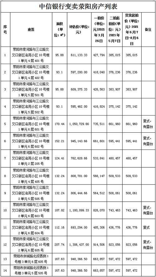 望有需求和有意向的客户积极参与拍卖或向他人推荐,可通过扫描附件中变卖二维码或在淘宝网阿里拍卖中搜索“索河路与三公路”、“京城路北段西侧”等关键词进入房屋拍卖界面。咨询、展示看样的时间与方式:自2021年6月8日起至2021年8月6日10时止接受咨询有意者请与中信银行郑州分行联系统一安排看样。如有疑问,请咨询张律师13703987769或邹经理55588155,以下为变卖房产列表。