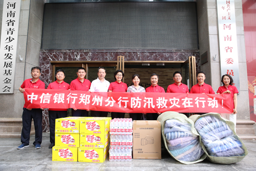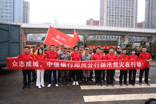 7月23日上午,中信银行郑州分行前往抗汛救灾一线,将600双胶鞋、1000件雨衣、1000箱方便面、1000条毛巾、2000双袜子,捐赠给正在郑州抗汛救灾的“杨根思”部队,以解部队燃眉之急;向郑东新区管委会社会事业局捐赠抗汛救灾资金50万元。