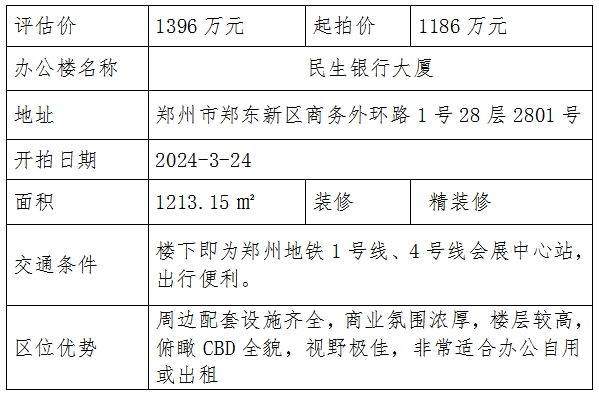 河南自由贸易试验区郑州片区人民法院将于2024年3月24日10时-2024年3月25日10时依法强制拍卖上述房产,本次拍卖为司法一拍,起拍价为1186万元(评估价1396万元)。该房产系郑州市CBD外环整层写字楼,属于民生银行大厦,因位置佳、办公氛围较好,该大厦出租率极高,所在楼层为28楼(总层数30层),视野又极其开阔,俯瞰郑东CBD艺术中心、会展中心、如意湖景区,交通便利,紧邻地铁1号线、4号线会展中心站,配套完善。房产建筑面积为1213.15㎡,套内面积870.25㎡,房产属于借款人办公自用,无经营后目前处于闲置状态,后续法院可腾房,竞买人竞得后可自用可出租。