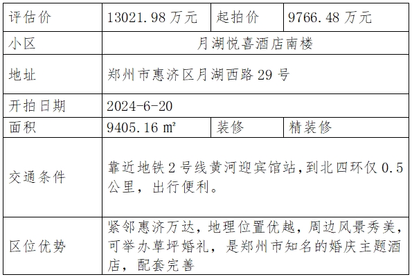中信银行郑州分行在法院申请执行河南某公司过程中,查封了抵押人名下位于郑州市惠济区月湖西路29号的酒店一座。郑州高新技术产业开发区人民法院将于2024年6月20日10时起至2024年6月21日10时止依法强制上述房产,起拍价为9766.48万元。该房产系独栋酒店,是以婚庆为主题,集餐饮、会议中心于一体的大型多功能综合性酒店。酒店位于郑州市惠济区月湖西路29号,为月湖悦喜酒店南楼,周边风景秀美,可举办草坪婚礼,紧邻惠济万达,地理位置优越,是郑州市知名的婚庆主题酒店,配套完善,租金可观。抵押房产建筑面积为9405.16平方米,单独的土地宗地面积为5835.02平方米,司法评估价为13021.98万元(包含装饰装修价值3151.26万元),本次拍卖起拍价为9766.48万元,单价仅万余元。