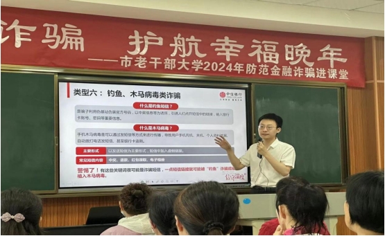 为全力做好金融“五篇大文章”,聚焦养老金融发展需求,助力“银发群体”提高识别和防范金融诈骗能力,该行浉河支行党支部主动走进信阳市老干部活动中心,开展“防范金融诈骗 护航幸福晚年”反诈知识讲座。支部党员代表通过视频播放、案例分享、互动问答等多种形式,向老干部学员们详细讲解金融诈骗的常见类型、手法及防范措施。短视频生动有趣、寓教于乐;案例分享警钟长鸣、发人深省;防诈口诀简单易记、便于运用;互动环节交流顺畅、成效显著,有效提升参与讲座的各位中老年客户识别、防范金融诈骗能力。近日,一位年近七旬的老人,因行动不便无法亲自到银行办理业务。得知情况后,中信银行信阳浉河支行迅速启动了上门服务机制,党员干部带队前往老人家中,通过耐心的沟通和细致的服务,不仅帮助老人顺利办理业务,还为其带去了许多实用的金融知识,让老人感受到了中信银行服务的温暖与贴心。