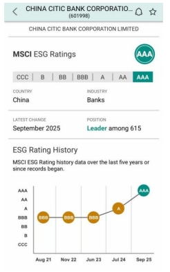 近日,国际权威指数机构明晟(MSCI)发布2025年度中信银行(601998.SH,00998.HK)环境、社会及管治(ESG)最新评级结果,评级由“A”上调两级跃升至全球最佳等级“AAA”级。这是继2024年从“BBB”提升至“A”后,中信银行MSCI ESG评级连续第二年提升,在全球同业中处于领先(leader)水平。