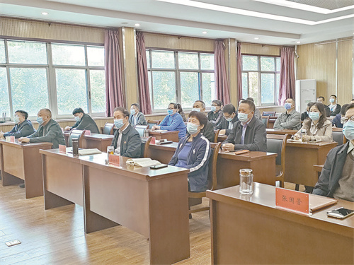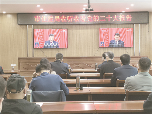市住建局党员干部在收听收看党的二十大开幕会。本报记者 张 璐 摄