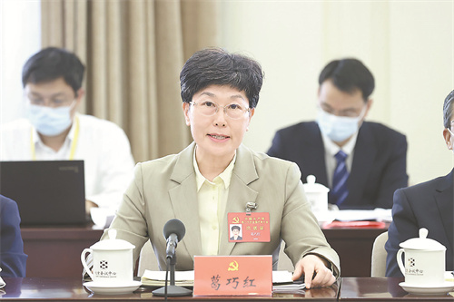党的二十大代表、焦作市委书记葛巧红在河南省代表团参加讨论。