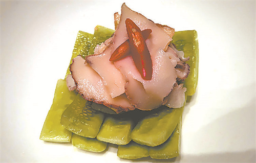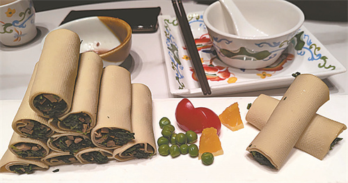 小花椒金汤酸菜鱼的厨师用豆腐皮卷上处理过的野菜等,一道保留着原味的美食腐皮芝麻卷便呈现在餐桌上。