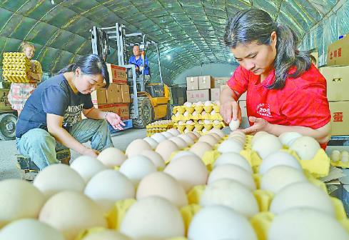 9月10日,武陟县小董乡磨庄村鸿益农牧专业合作社,社员在打包鸡蛋。该合作社现有饲养大棚40座,蛋鸡存栏量达30万只,平均日产蛋12吨,年收益达200万元,为本村及周边村民提供了50余个就业岗位。