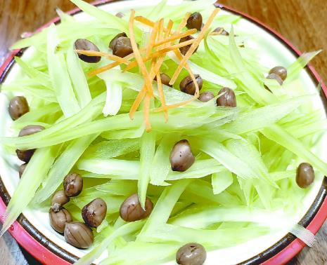该店新推出的压板肉拌黄瓜,黄瓜口感脆嫩、味道清淡,再佐以自制的压板肉,荤素搭配适宜。这道凉菜无论是作为开胃菜还是配餐的一部分,都能为餐桌增添一分清新的风味。凉拌脆芹菜,入口清脆,香而不腻,芹菜还有降血脂等作用。