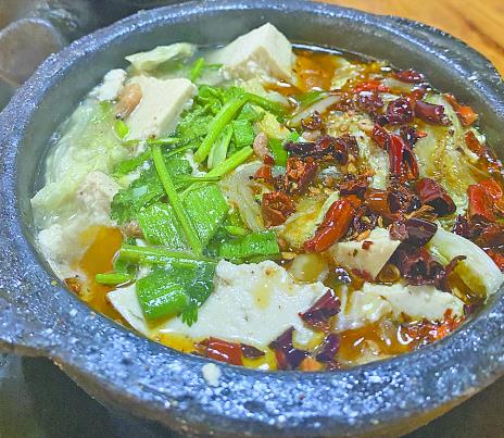 武陟砂锅,传承千年。制作时,先将肉类食材热锅清水断生、去异味,然后放入盛有清水的砂锅内,旺火烧开,再用小火慢慢煨煮,汤味浓厚,肉质酥嫩香烂。最令人惊艳的是,武陟砂锅端上餐桌后,服务员会端着一勺刚炸好的红辣椒油倒入砂锅,“刺啦”一声,刺激食客们的味蕾。