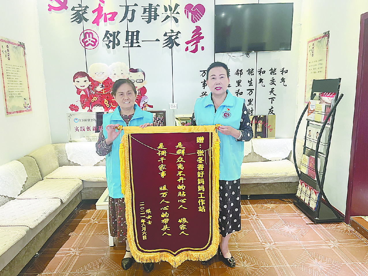 上图 吴爱香(右)收到群众送来的锦旗。