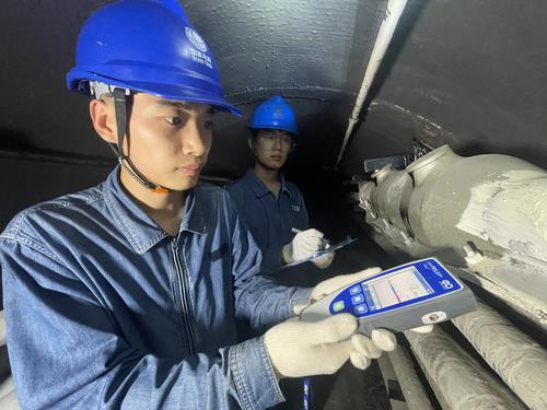 在进入电缆隧道之前,苏云龙要打开隧道通风井通风。当通风井的门被打开时,一股凉气从地下蹿了上来,让人不由地打了个激灵。从事配电电缆巡视工作需两个人同行。当天,苏云龙和同事崔乐乐搭班,他们相互检查安全帽、照明手电、检查仪器等工具后,就要通过竖井进入到电缆隧道了。竖井壁上的爬梯很简易,记者按照苏云龙交代的动作要领,手脚并用,终于下到距地面4米深的电缆隧道内。