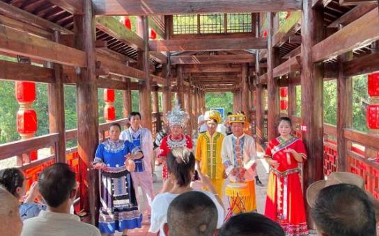 图为8月17日,杨胜来带领表演团队在湖北省宣恩县一景区表演。张畅摄
