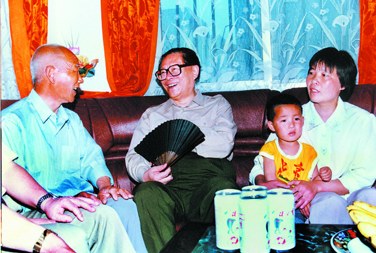 江泽民一行来到回族群众聚居的沁阳市水南关村,参观了村办企业新星制革厂后又顺便拐进了村委会主任丁根生的家。江泽民进屋后亲切地拉着丁根生父亲的手问长问短。