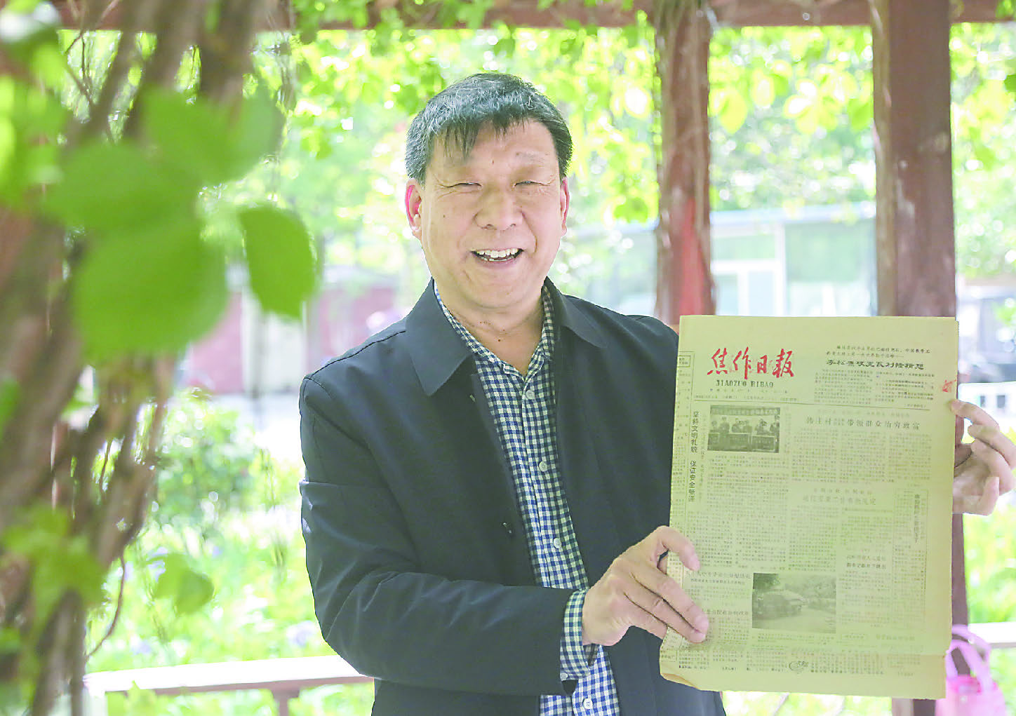 4月25日,一个阳光明媚的午后,《焦作日报》金牌读者王玉泉来到解放区都市花园小区一处爬满葡萄藤蔓的长廊下,与记者一起翻看一张张泛黄的报纸,追忆小城故事,回味青葱岁月。