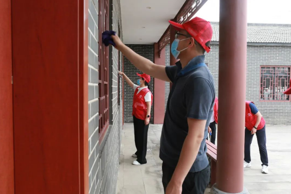 志愿者们组织清扫了场馆卫生。大家手持扫帚、抹布等清洁工具,认真清理纸屑、烟头,仔细擦拭门窗、玻璃,将纪念馆内外打扫的干干净净。在工作人员的指导下,帮助维护游览秩序,讲解文明旅游行为规范,发放文明旅游倡议书。