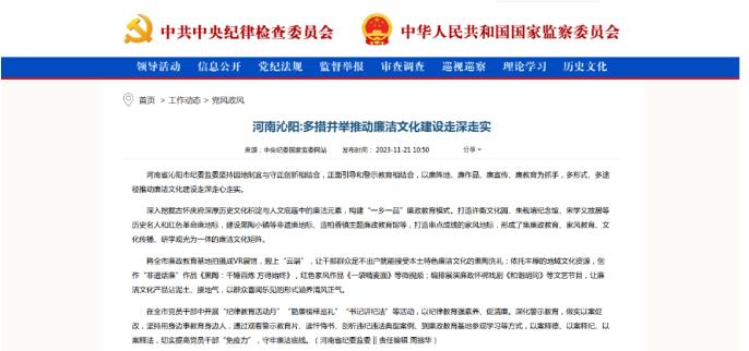 11月21日,中央纪委国家监委网站发布沁阳市纪委监委加强廉洁文化建设的做法。全文如下: