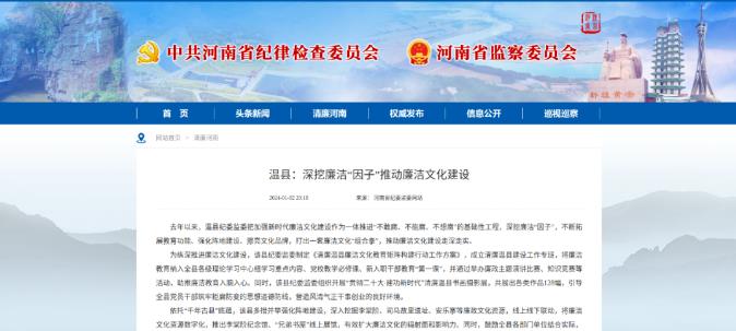 为纵深推进廉洁文化建设,该县纪委监委制定《清廉温县廉洁文化教育矩阵构建行动工作方案》,成立清廉温县建设工作专班,将廉洁教育纳入全县各级理论学习中心组学习重点内容、党校教学必修课、新入职干部教育“第一课”,并通过举办廉政主题演讲比赛、知识竞赛等活动,助推廉洁教育入脑入心。同时,该县纪委监委组织开展“贯彻二十大·建功新时代”清廉温县书画摄影展,共展出各类作品128幅,引导全县党员干部筑牢拒腐防变的思想道德防线,营造风清气正干事创业的良好环境。